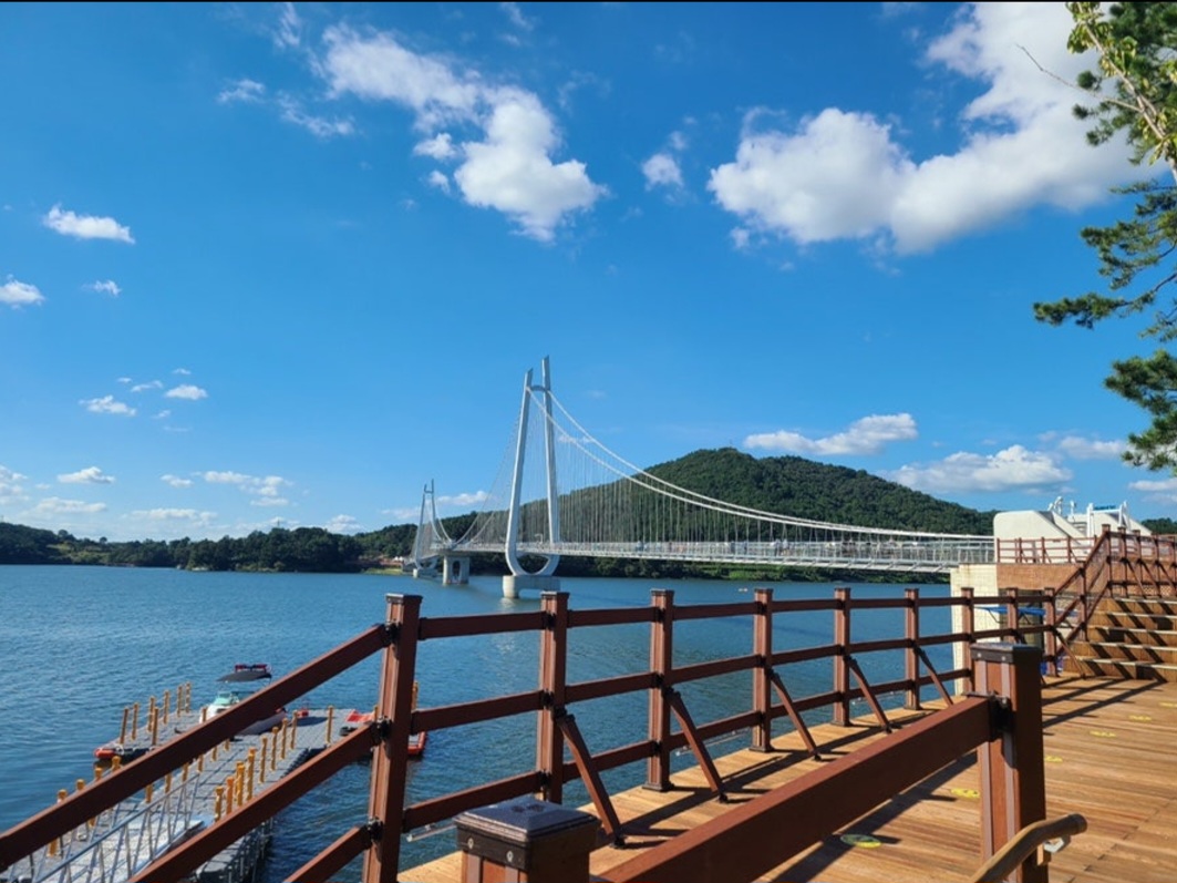 다리에 서자마자 양쪽으로 펼쳐지는 탑정호의 풍경이 정말 장관이에요. 🌊 다리 한가운데에 서면 살짝 흔들리는 스릴도 느껴지는데, 그때 여자친구와 손을 꼭 잡고 걸으니 더 설렜답니다. 💑